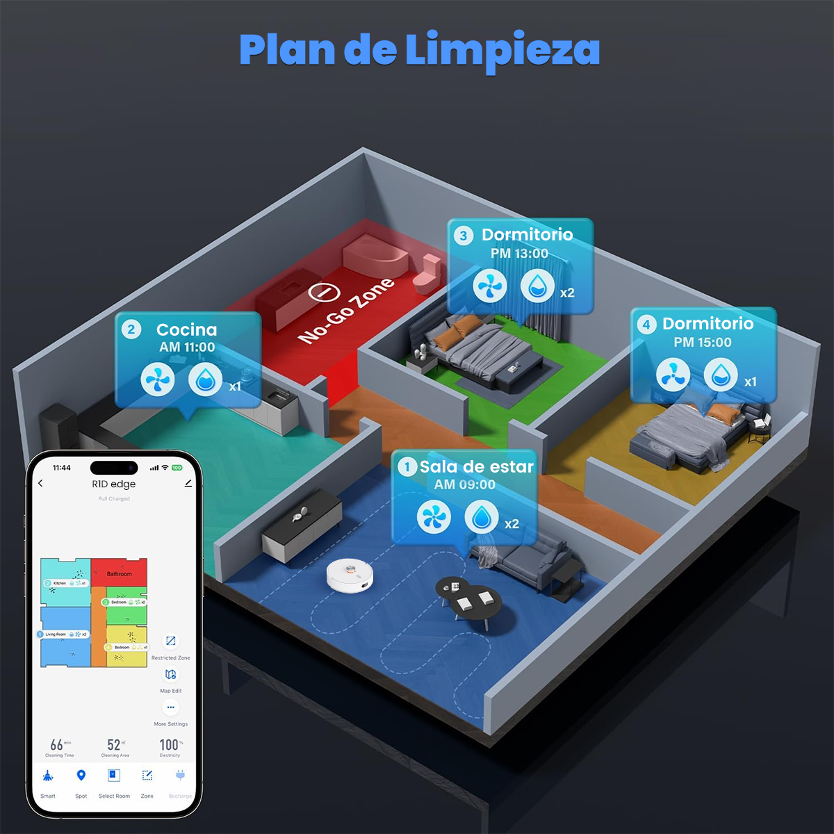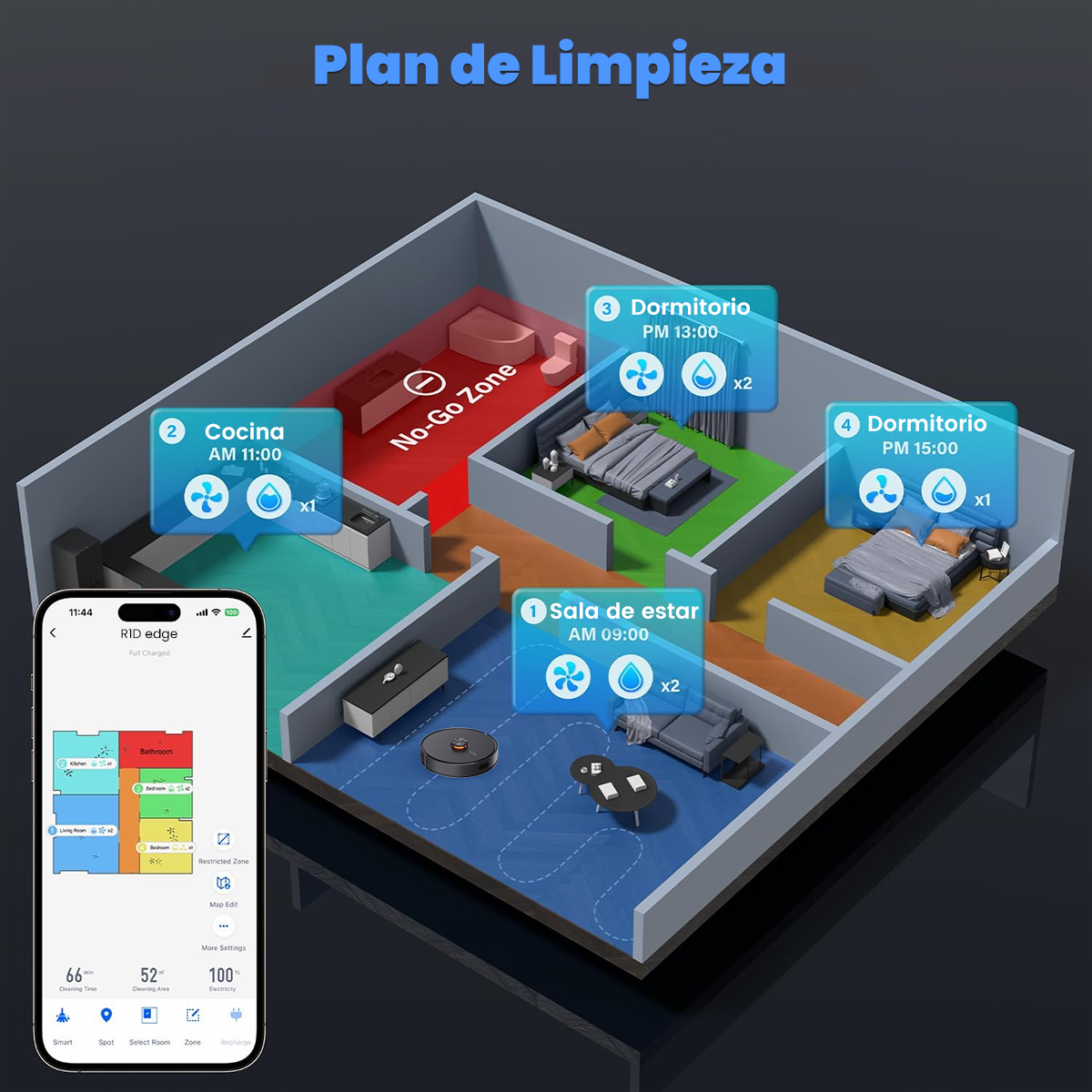 Este aspiradora inteligente tiene una duración máxima de 100 minutos, lo que permite limpiar hasta 120 m² en una sola sesión, adecuado para grandes espacios y múltiples habitaciones.